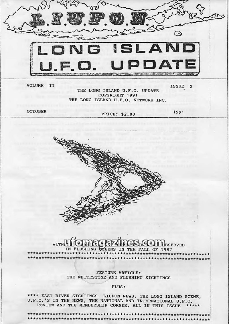 This issue of the Long Island UFO Update from October 1991 covers various UFO sightings and related events. It features a witness drawing of a boomerang object seen in Flushing in