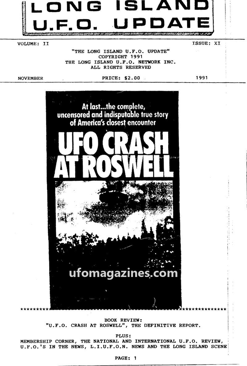 This issue of Long Island UFO Update from November 1991 covers ongoing UFO activity and investigations. It includes a detailed book review of 'UFO Crash at Roswell' by Kevin Randle