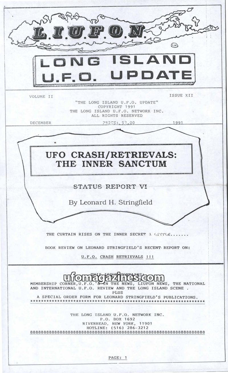 This issue of the Long Island UFO Update (Vol. II, Issue XII, December 1991) features Leonard H. Stringfield's 'Status Report VI' on UFO crash/retrievals, detailing cases from the