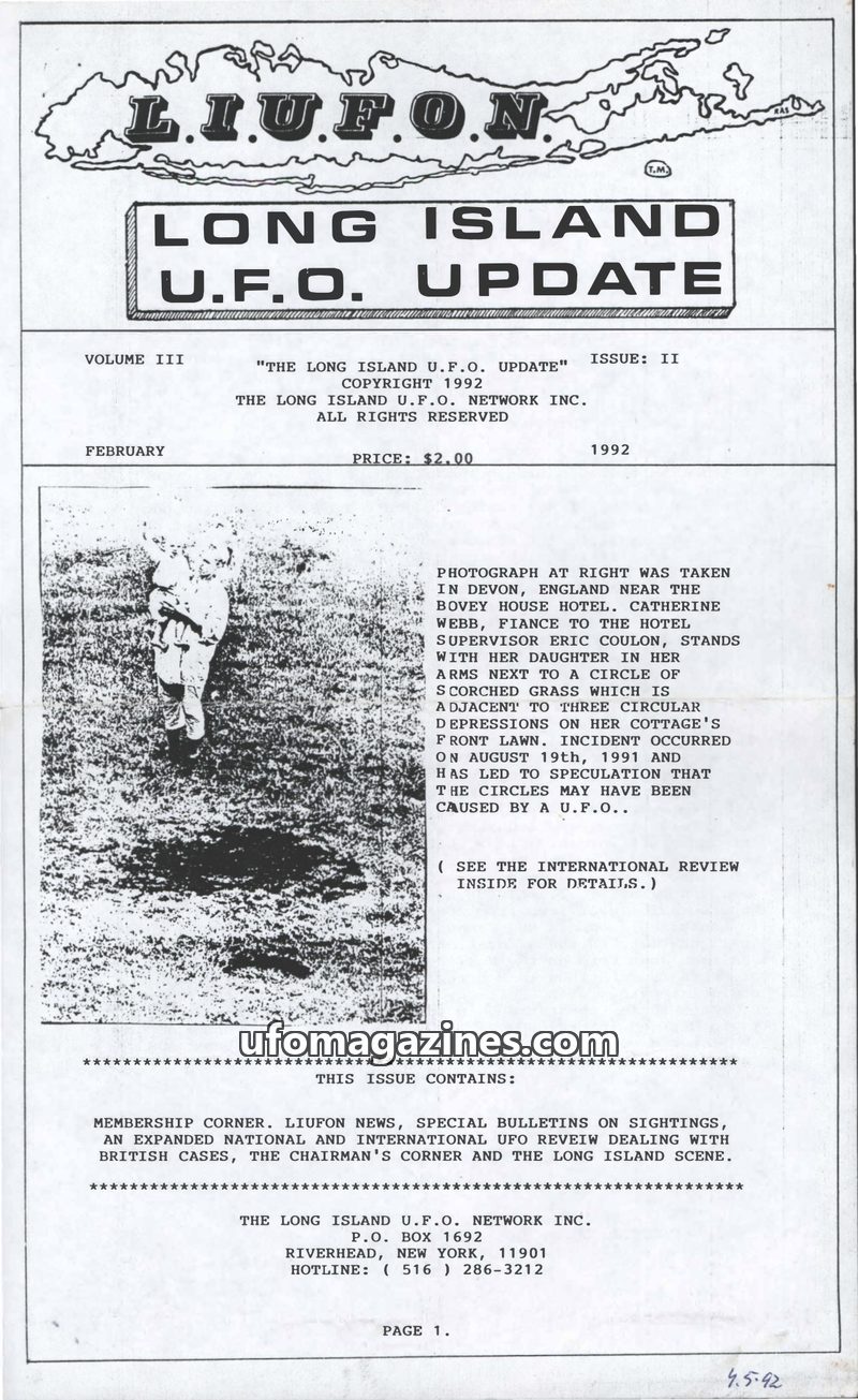 This issue of Long Island UFO Update covers a range of UFO-related events from early 1992 and late 1991. It features a photograph of a UFO-related incident in Devon, England, invol