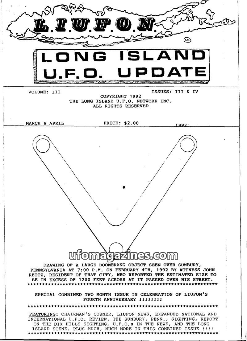 This combined March-April 1992 issue of Long Island UFO Update celebrates LIUFON's fourth anniversary. It details the Sunbury, Pennsylvania boomerang sighting by John Reitz and 16
