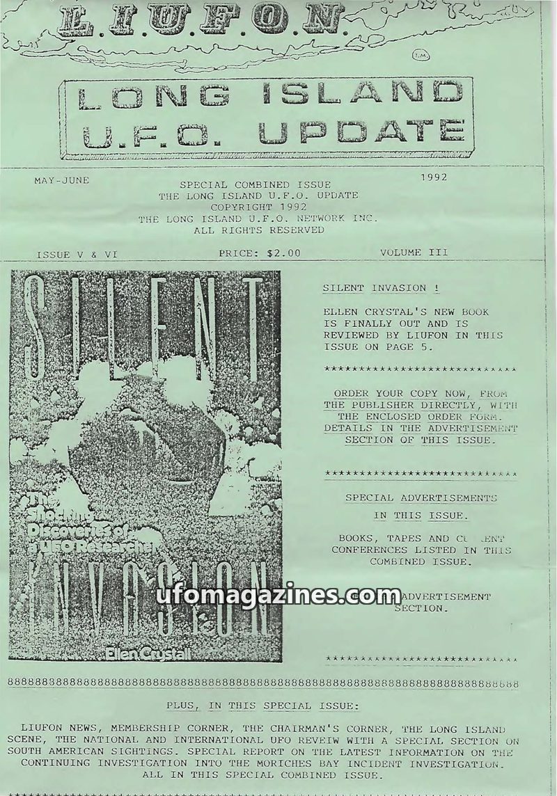 This issue of Long Island UFO Update covers the latest in UFO research and sightings. It features a review of Ellen Crystall's book 'Silent Invasion,' detailing her twelve years of