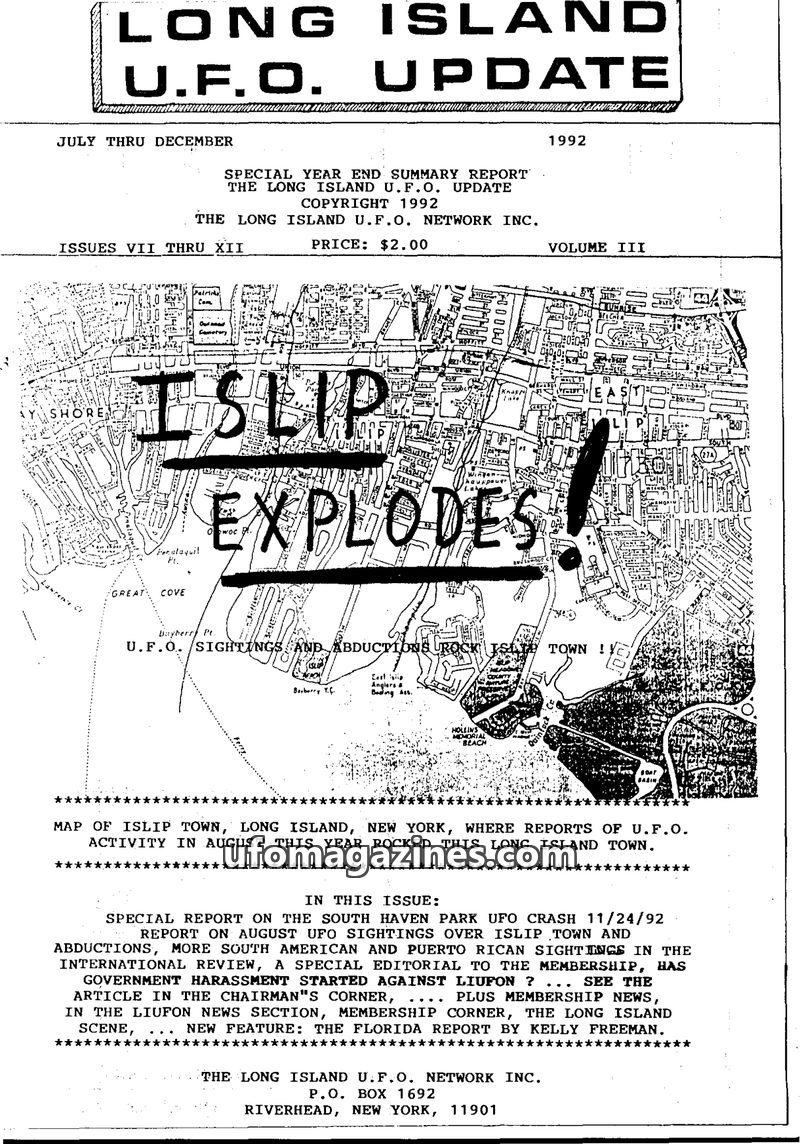This issue of the Long Island UFO Update (July-December 1992) is a special year-end summary report. It features a special report on the South Haven Park UFO Crash (11/24/92) and a