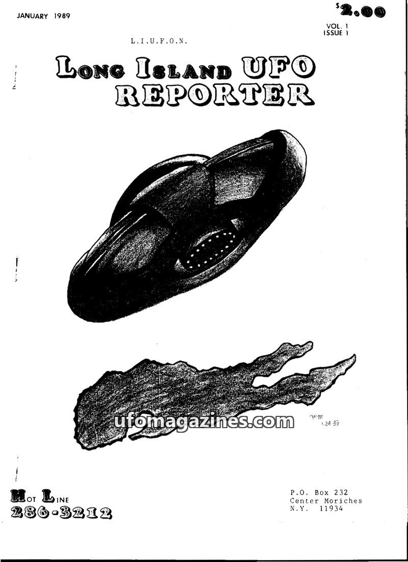 This issue of the Long Island UFO Reporter, dated January 1989, details recent UFO sightings and investigations conducted by the Long Island UFO Network (LIUFON). It highlights inc