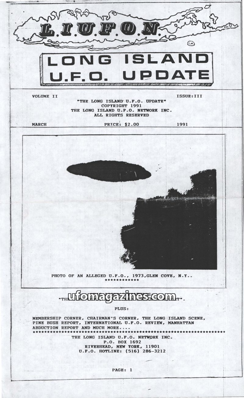 This issue of the Long Island UFO Update from March 1991 covers the analysis of a 1973 UFO photograph from Glen Cove, NY, detailing witness testimony and expert opinions on its aut