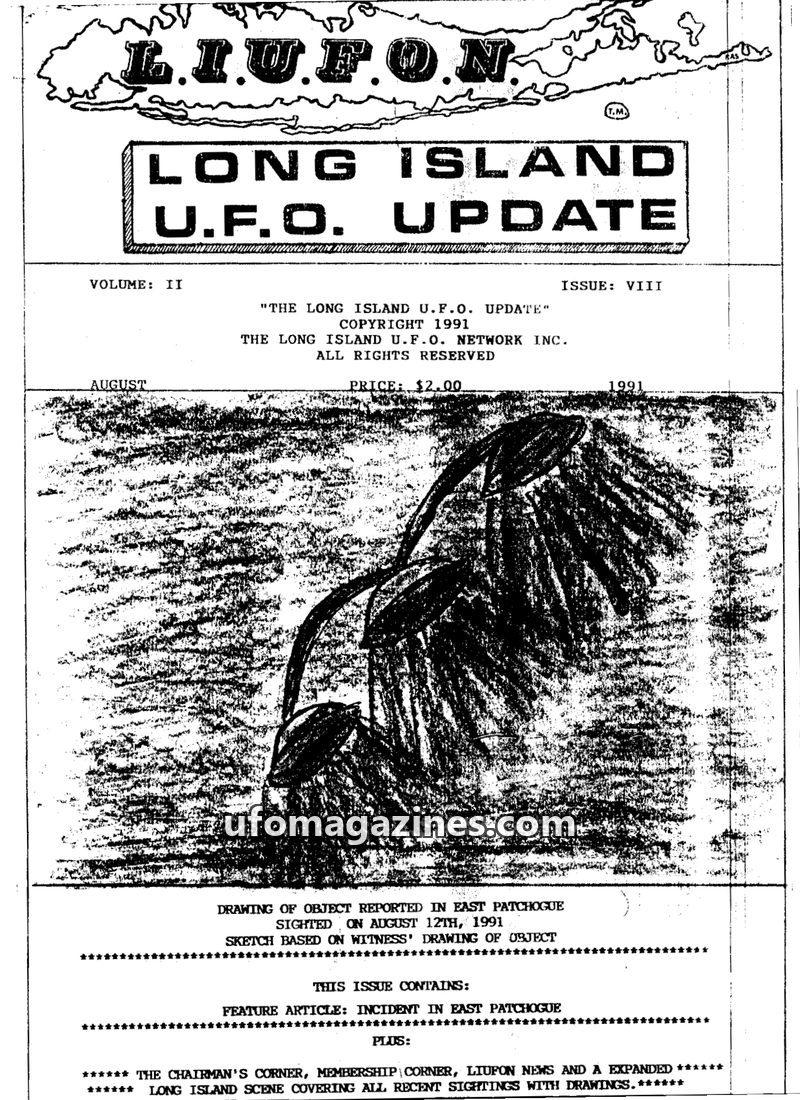 This issue of Long Island UFO Update from August 1991 details recent UFO sightings and investigations by LIUFON. It features a special report on the East Patchogue incident involvi