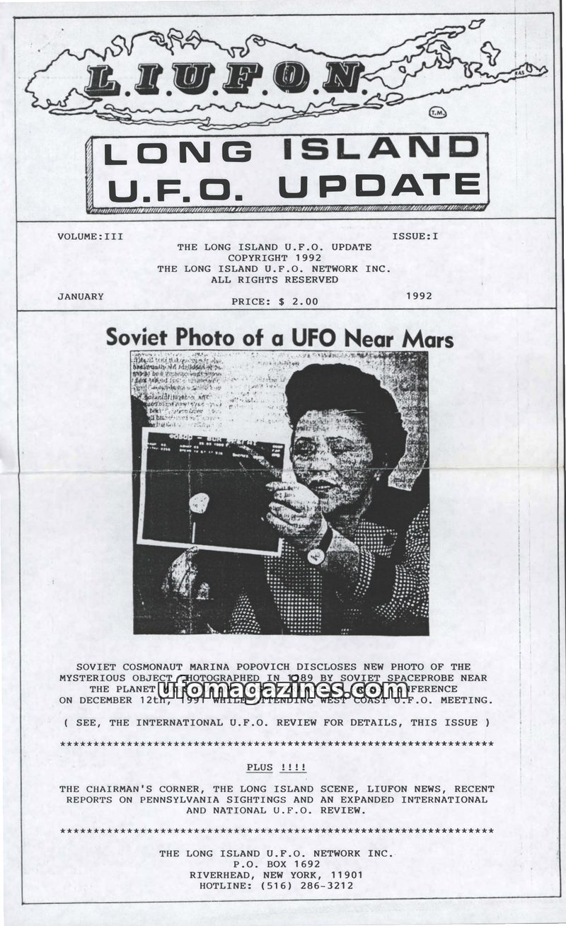 This issue of the Long Island UFO Update from January 1992 highlights a new photo of a mysterious object near Mars disclosed by Soviet Cosmonaut Marina Popovich. The magazine also