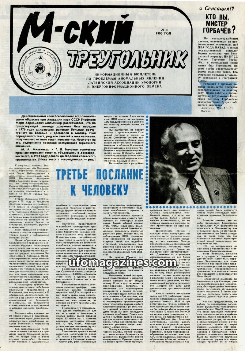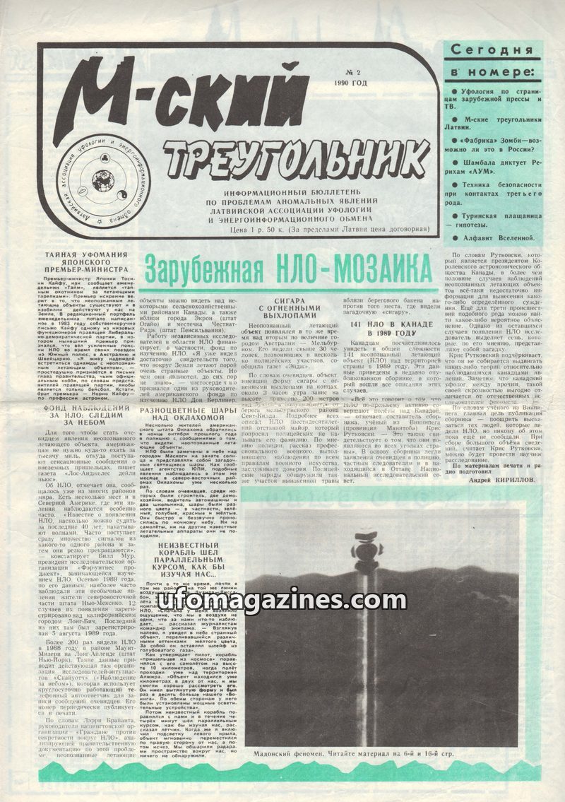 This issue of M-SKIY TREUGOLNIK delves into various UFO phenomena, including reports from Japan's Prime Minister's belief in UFOs, a mosaic of international sightings from Canada a