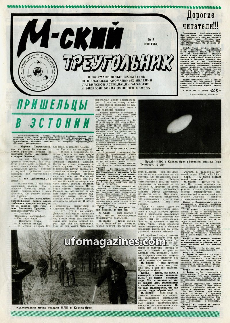 This issue of 'M-SKI TREUGOLNIK' focuses on UFO phenomena in Estonia, detailing sightings in Kohtla-Järve and interviews with experts. It also features discussions on parapsycholog