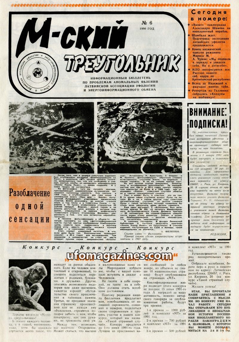 This issue of 'M-ский Треугольник' debunks a sensational UFO photograph of a bomber on the Moon, attributing it to a hoax. It details the ongoing preparations for an expedition to