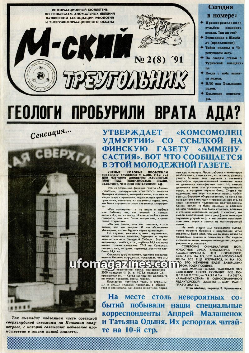 This issue of 'M-ский ТРЕУГОЛЬНИК' explores alleged paranormal phenomena, including a sensational report of geologists drilling into 'hell' on the Kola Peninsula and UFO sightings
