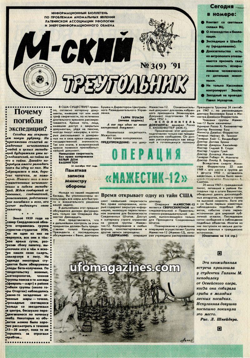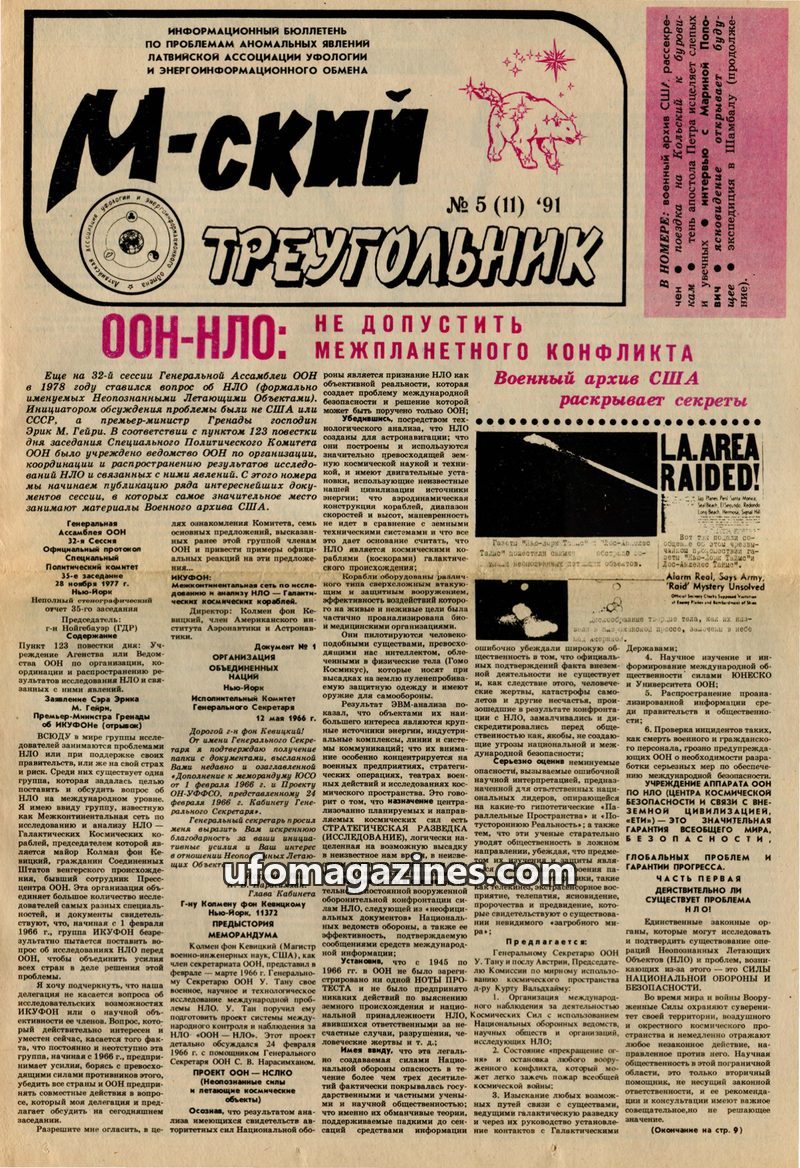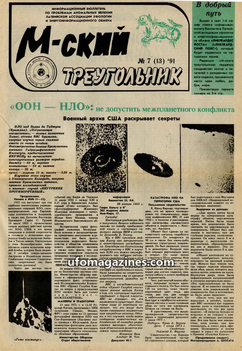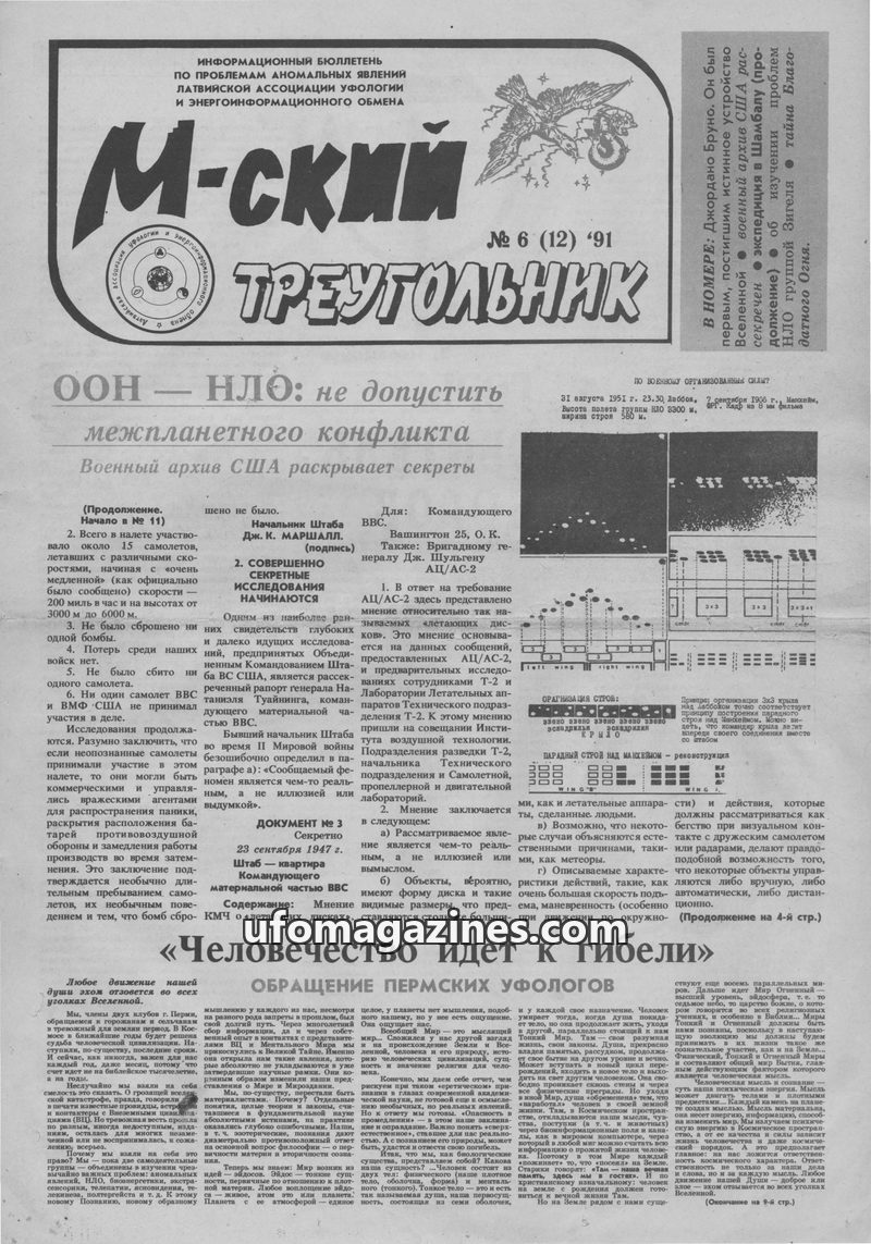 This issue of 'M-ский Треугольник' from 1991 delves into the topic of UFOs and potential interplanetary conflict, featuring declassified US military documents from 1947 that confir