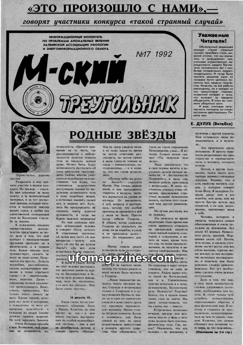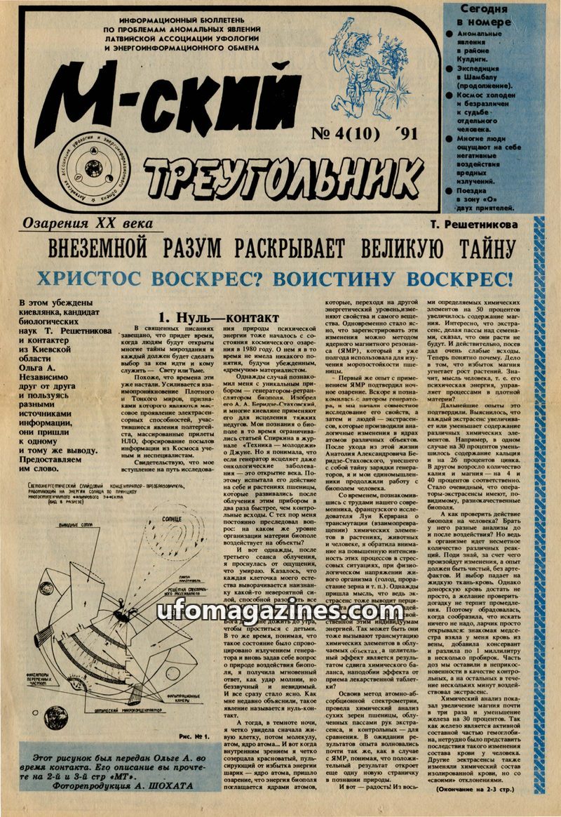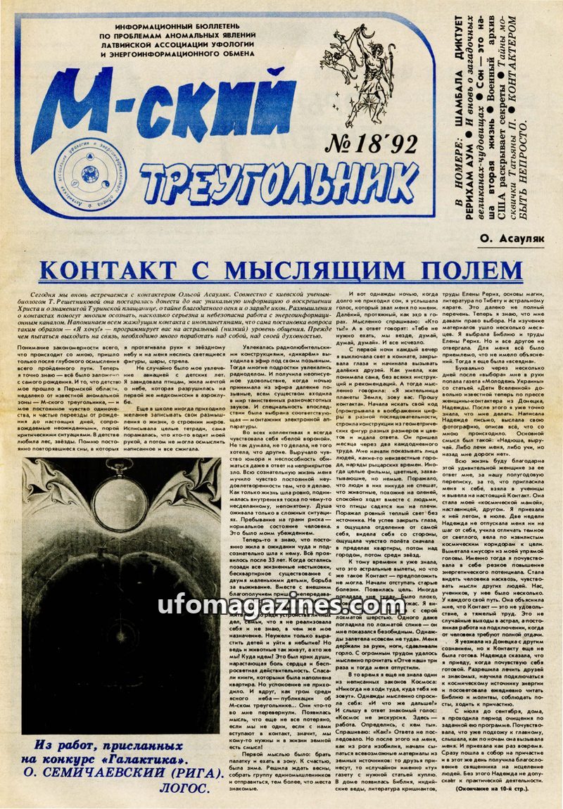 This issue of 'M-ский ТРЕУГОЛЬНИК' delves into 'Contact with the Thinking Field' through the experiences of contactee Olga Asaulak, who describes receiving information and undergoi