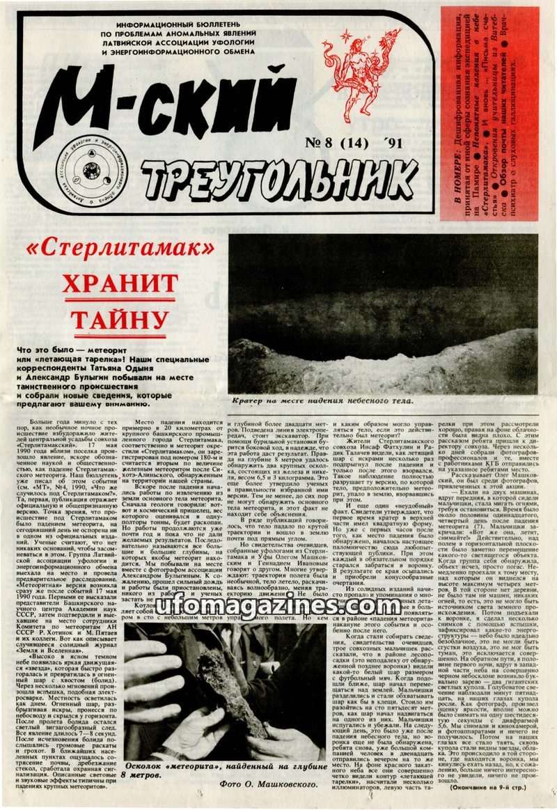 This issue of 'M-sky Treugolnik' delves into the mysterious 'Sterlitamak meteorite' incident of May 17, 1990, where a large crater was formed but the main object remained elusive.