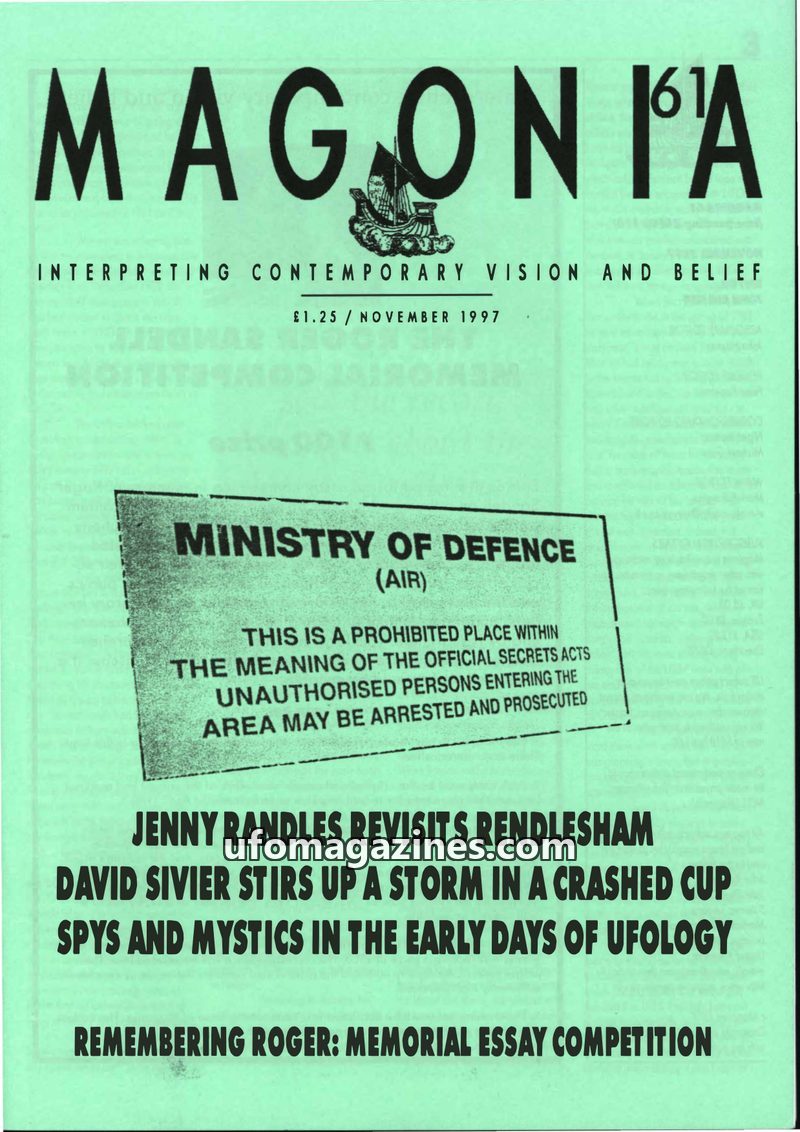 This issue of Magonia delves into the Rendlesham Forest incident, with Jenny Randles revisiting claims made by Larry Warren and comparing them to other witness accounts and previou