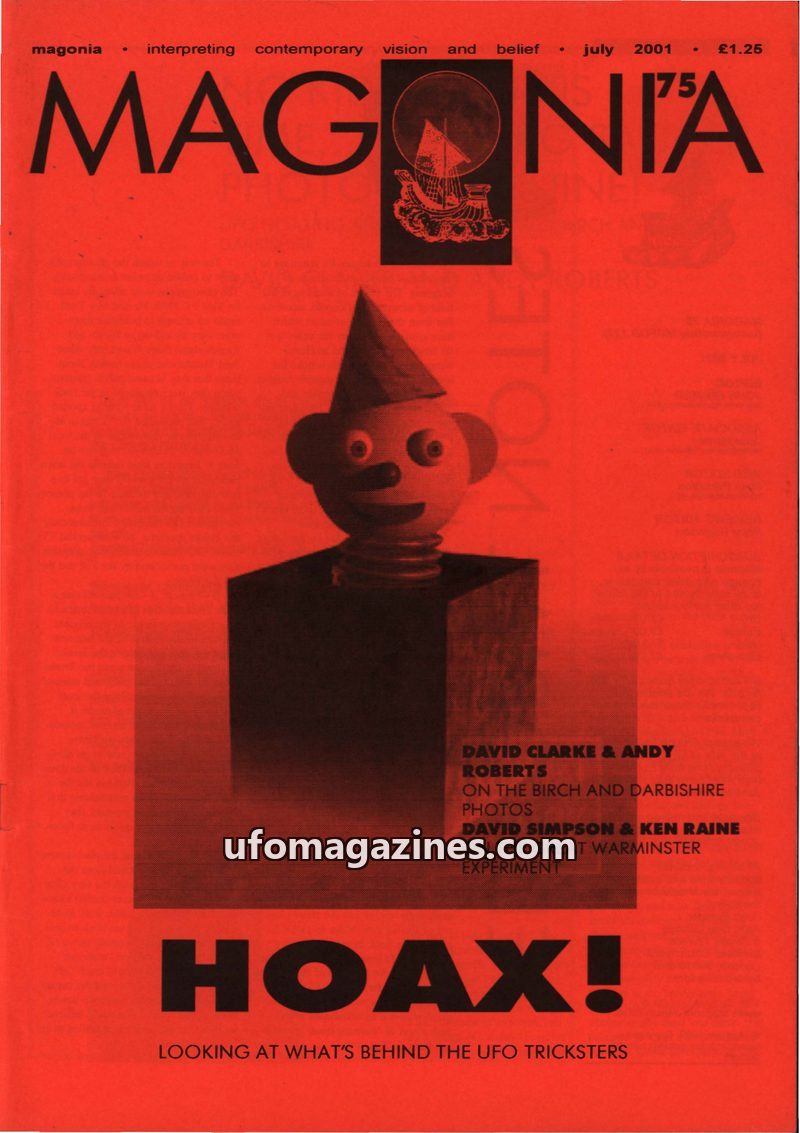 This issue of Magonia focuses on UFO hoaxes, questioning the authenticity of famous cases. It examines the Stephen Darbishire and Alex Birch photographs, exploring the motivations