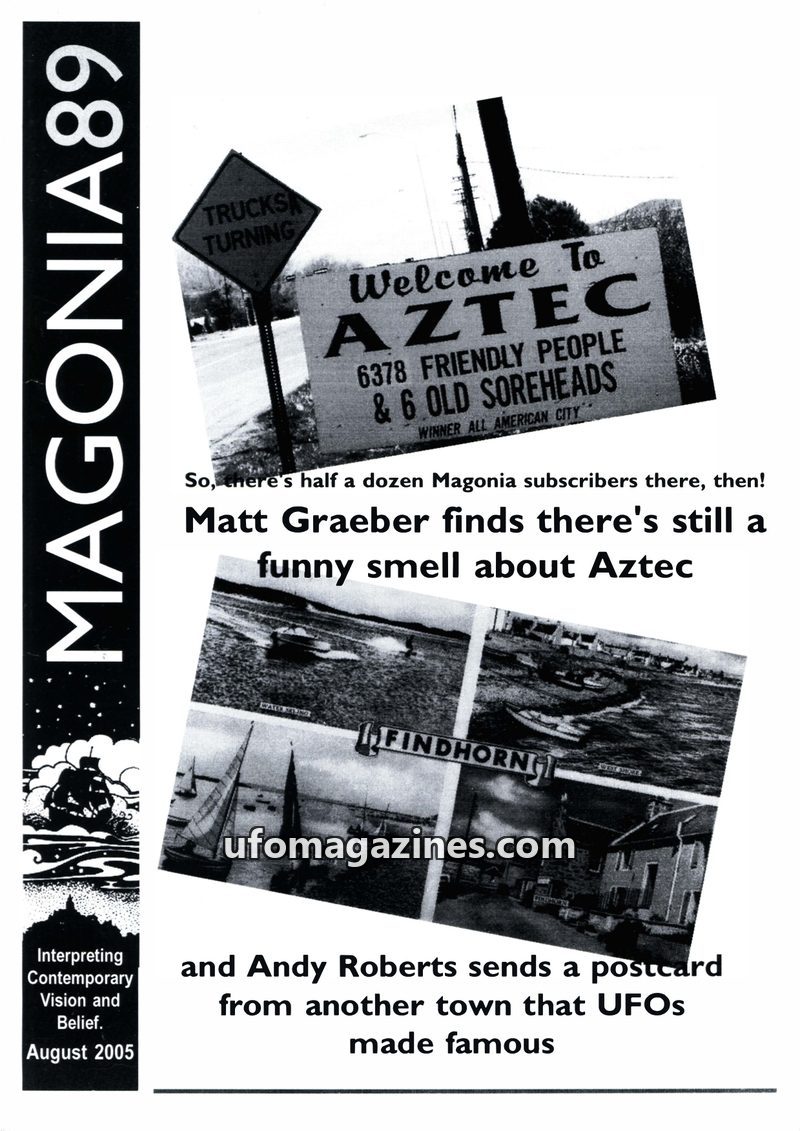 This issue of Magonia delves into the persistent Aztec UFO retrieval story, examining its various resurrections and the individuals involved. It also investigates the Findhorn Comm