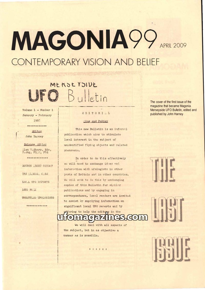 Magonia 99 marks the final print issue of the magazine, which has evolved from the Merseyside UFO Bulletin since 1968. The editorial reflects on the perceived lack of progress in u