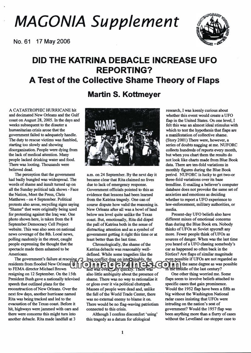 This issue of Magonia Supplement explores the hypothesis that UFO flaps are linked to collective shame, using the Katrina disaster as a case study. Analysis of NUFORC data from Jul