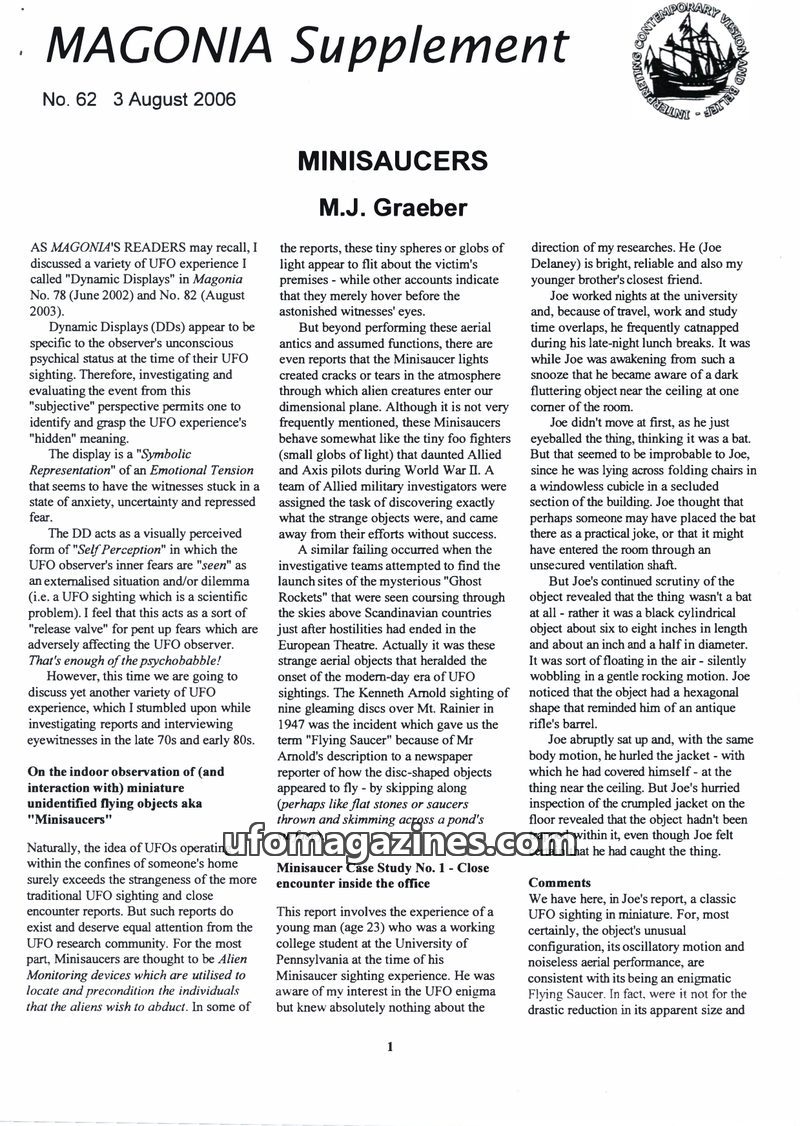 This issue of Magonia Supplement focuses on 'Minisaucers,' small UFOs encountered indoors or in close proximity. Author M.J. Graeber presents case studies of witnesses like Joe Del