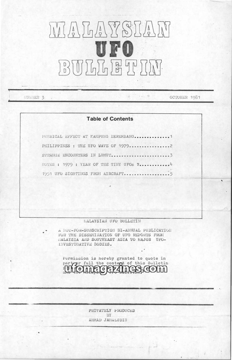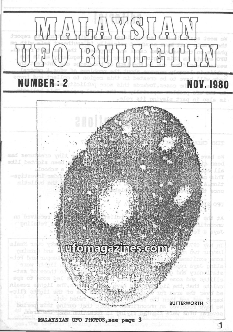 This issue of the Malaysian UFO Bulletin, dated November 1980, focuses on UFO reports from Malaysia and Southeast Asia. It includes eyewitness accounts of sightings in Petaling Jay