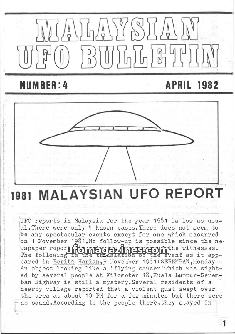 This issue of the Malaysian UFO Bulletin focuses on UFO reports from 1981, noting a low number of cases with one significant event on November 1, 1981, involving a 'flying saucer'