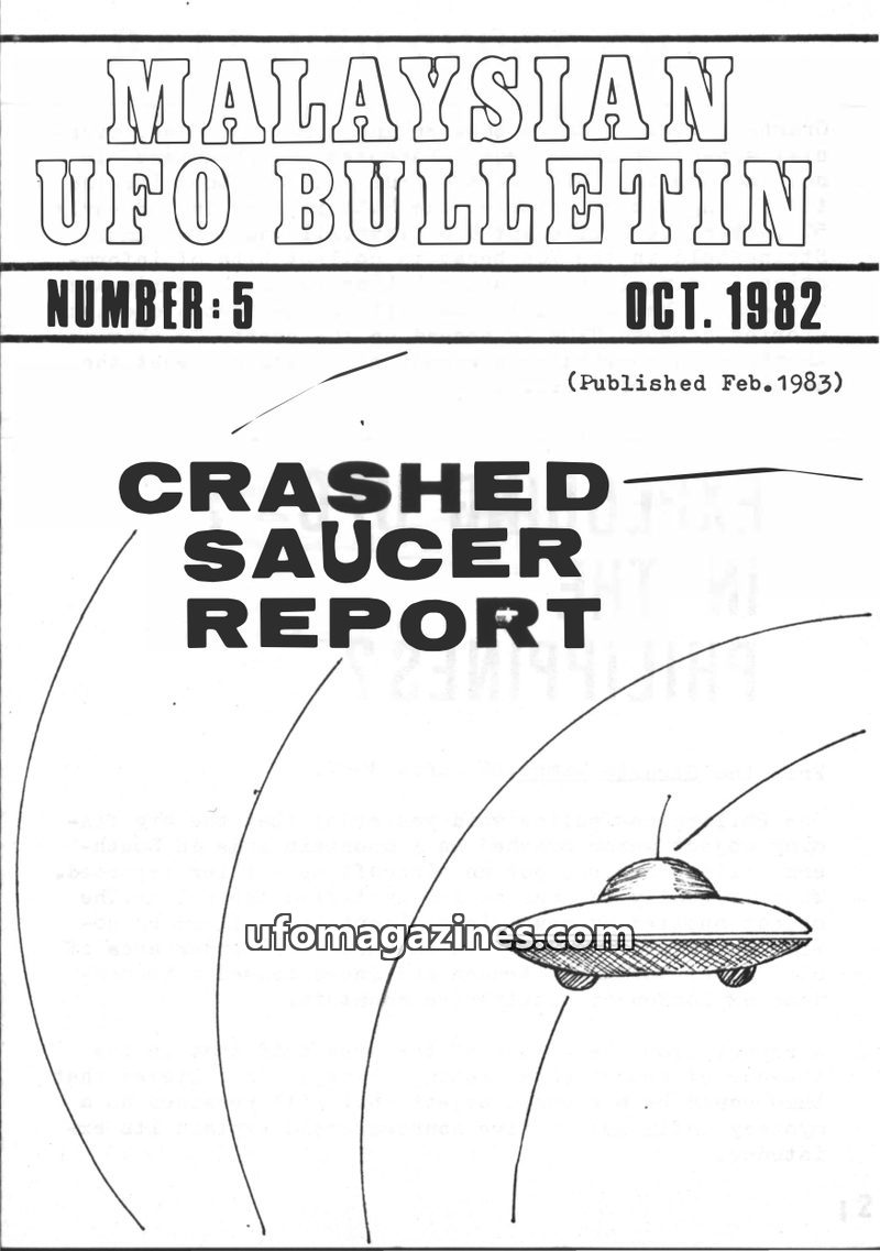 This issue of the Malaysian UFO Bulletin, dated October 1982 and published in February 1983, focuses on crashed saucer reports and aerial encounters. It details incidents in the Ph