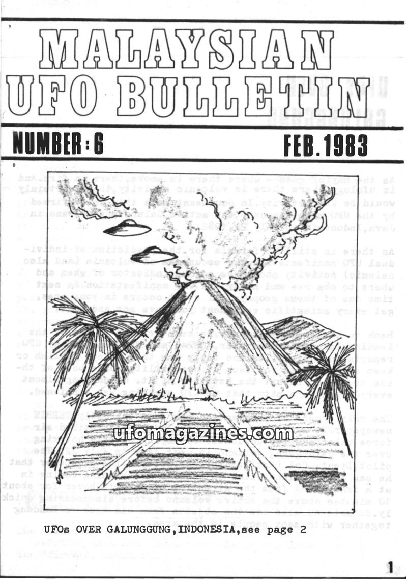 This issue of the Malaysian UFO Bulletin covers several UFO sightings and related phenomena across Southeast Asia. A key report details two UFOs observed over the active Galunggung