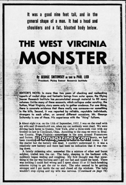This issue details the experience of George Snitowsky on September 13, 1952, near Sutton, West Virginia. His car broke down, and he encountered a nine-foot-tall creature with a man