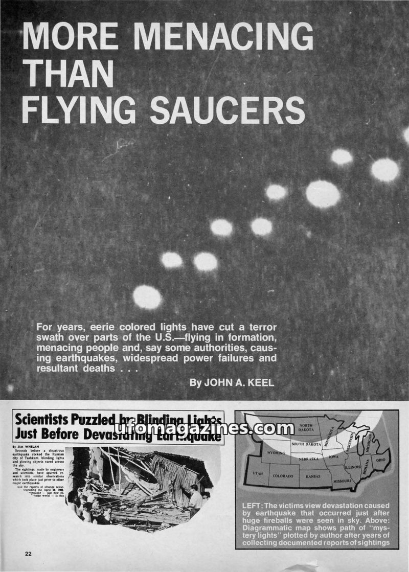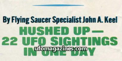 This issue of Flying Saucer magazine, featuring an article by John A. Keel, highlights a significant UFO flap on March 8, 1967, with 22 reported sightings in a single day, primaril
