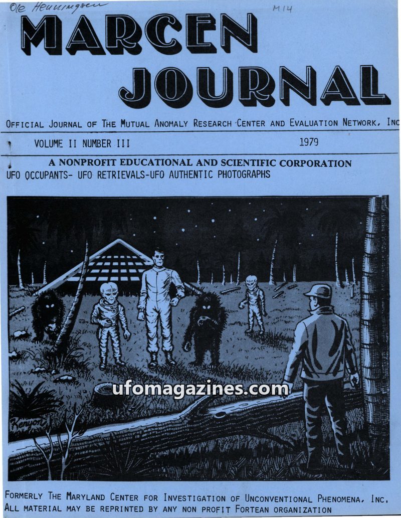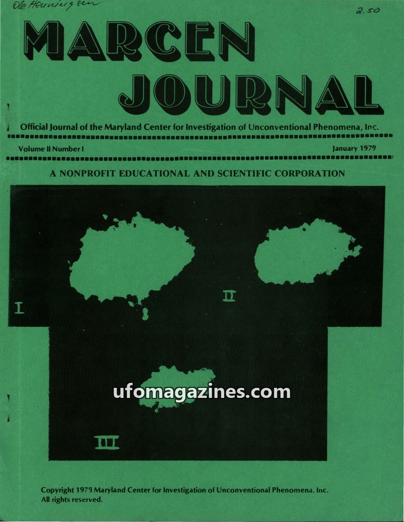 This issue of MARCEN JOURNAL, dated January 1979, focuses on UFO phenomena with a detailed analysis of cover photos from a 1973 Georgia sighting. It includes articles on the organi