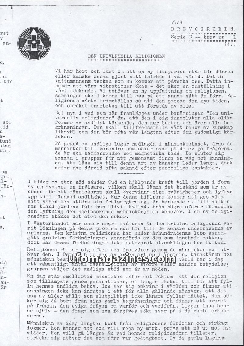 This issue of Brevcirkeln discusses the advent of the Universal Religion, coinciding with the Aquarian Age, which promises a new understanding of spirituality. It emphasizes the ne