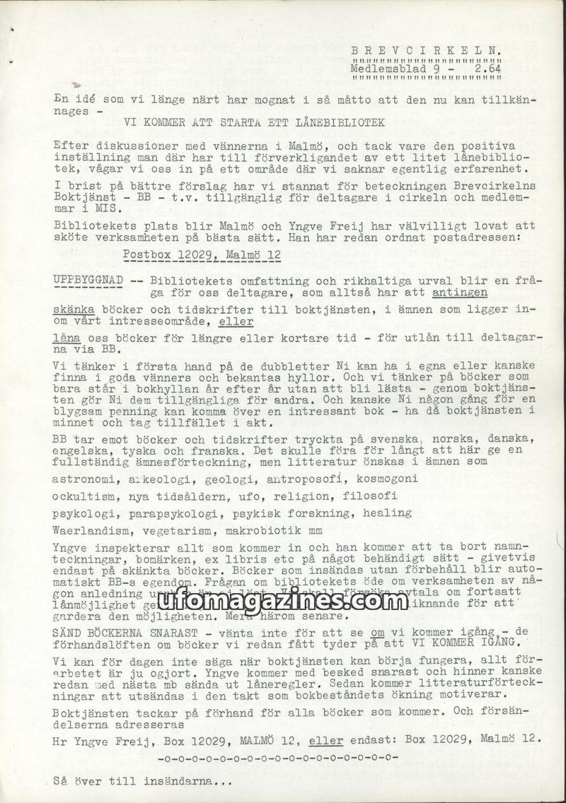 This issue of Brevcirkeln announces the establishment of a lending library in Malmö, managed by Yngve Freij, to share books and journals on topics such as astronomy, occultism, and