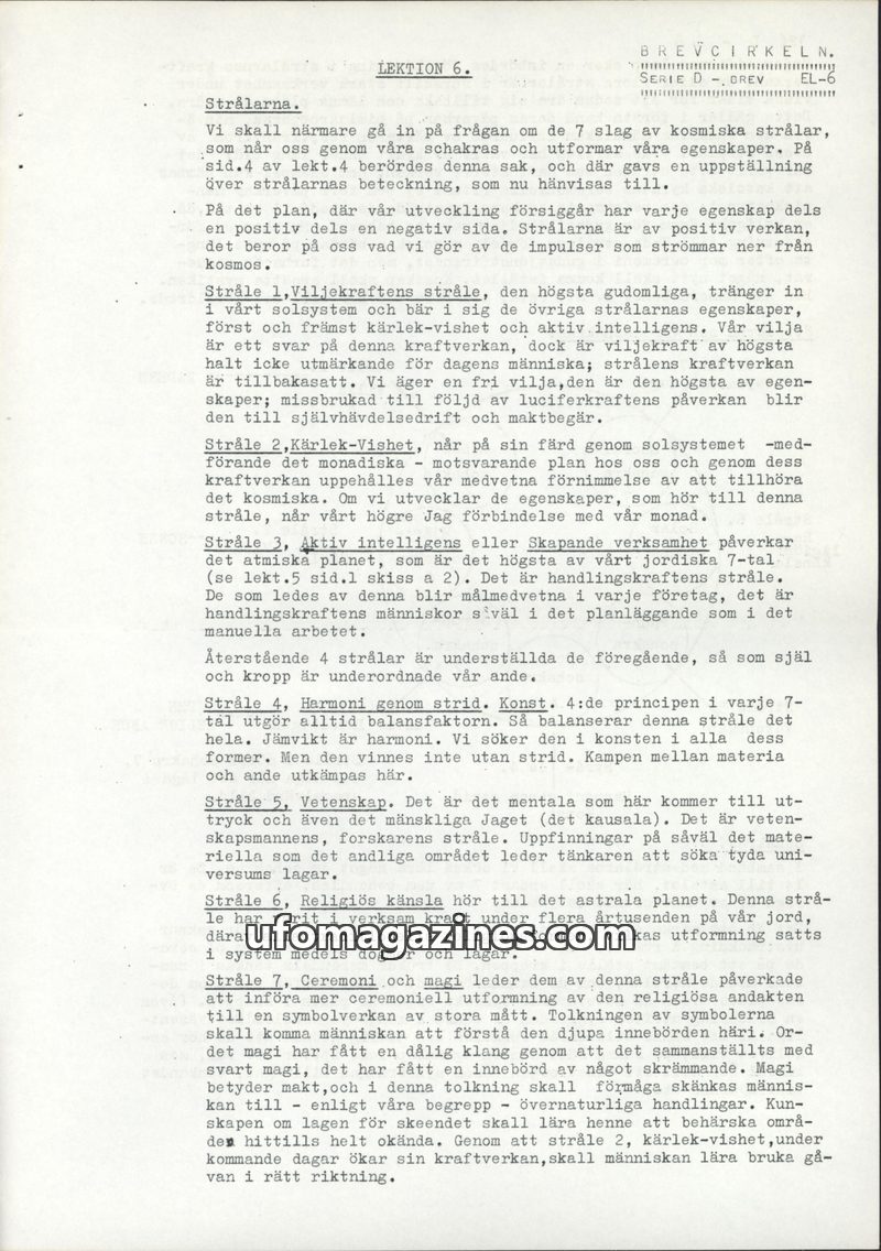 This issue of Brevcirkeln, titled 'Lektion 6: Strålarna', delves into the concept of seven types of cosmic rays and their impact on human chakras and characteristics. It explains t