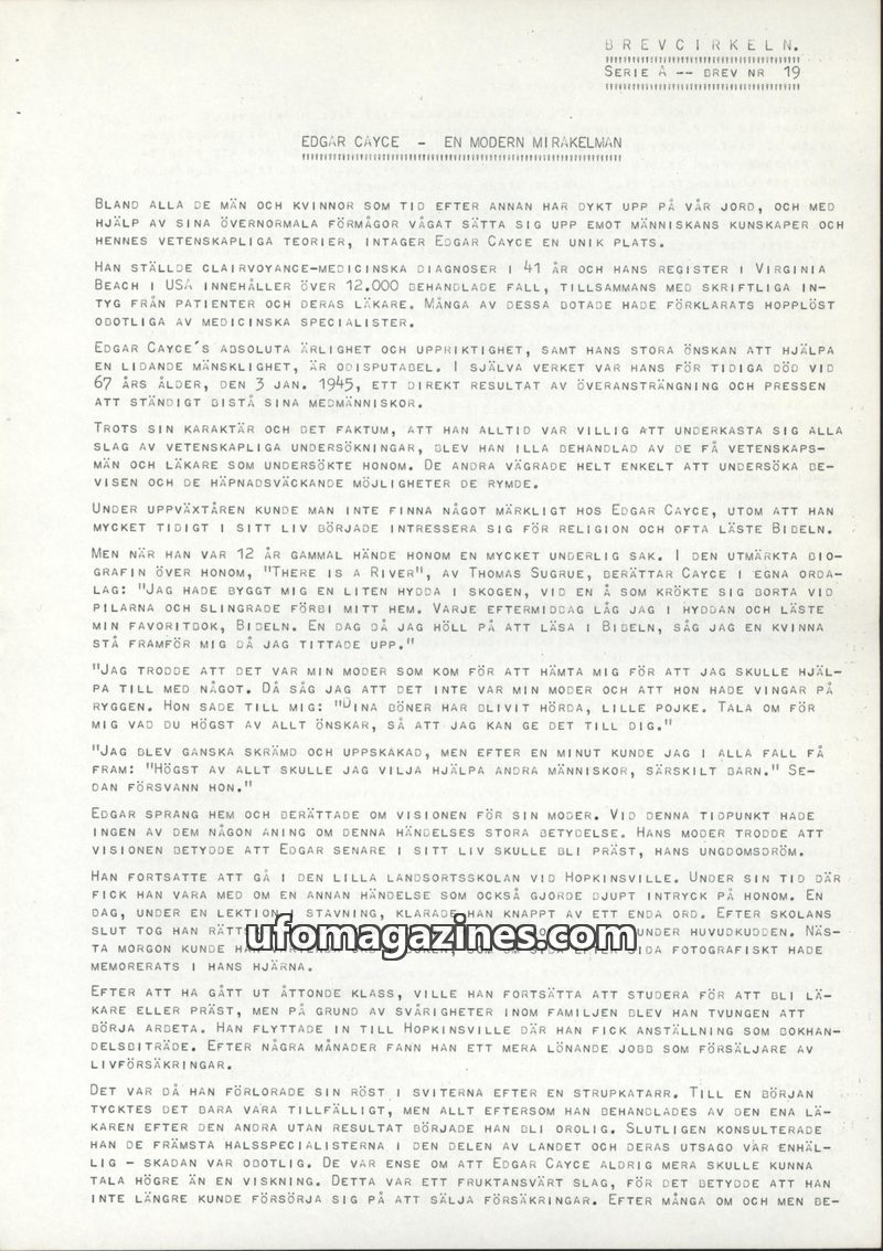 This issue of Brevcirkeln details the life and remarkable abilities of Edgar Cayce, a man who provided over 12,000 clairvoyant medical diagnoses and treated countless individuals,