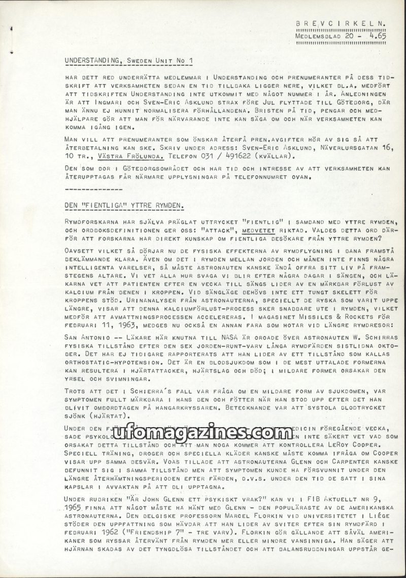 This issue of BREVCIRKELN, dated 1965, addresses the temporary halt of the 'Understanding' magazine due to editorial relocation and financial issues. It delves into the physiologic