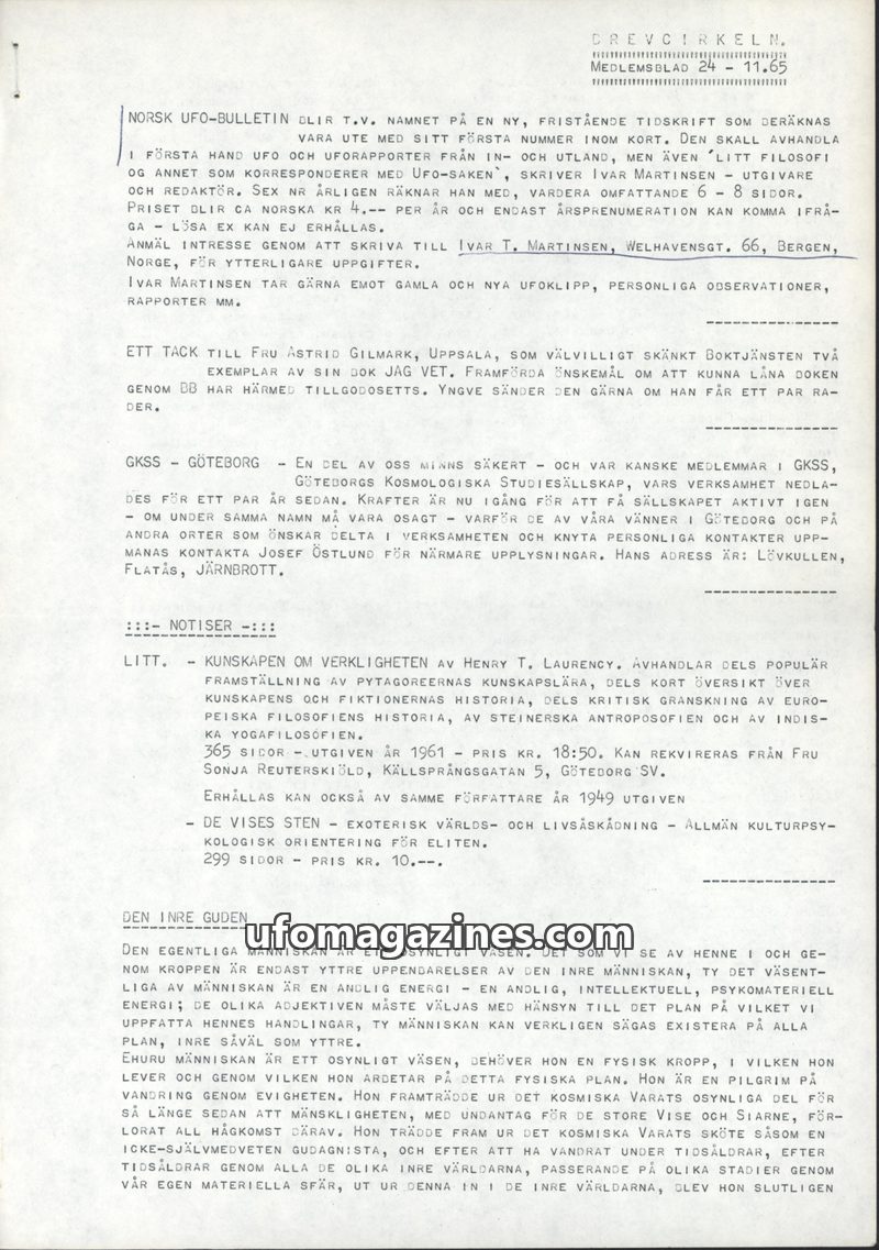 AI-generated English summaries and cover images of Medlemsblad 024 nov 1965 from the Archives for the Unexplained (AFU) in Norrköping, Sweden. Each entry summarises the complete contents of an issue — articles, sighting reports, interviews, key people, locations, and dates.