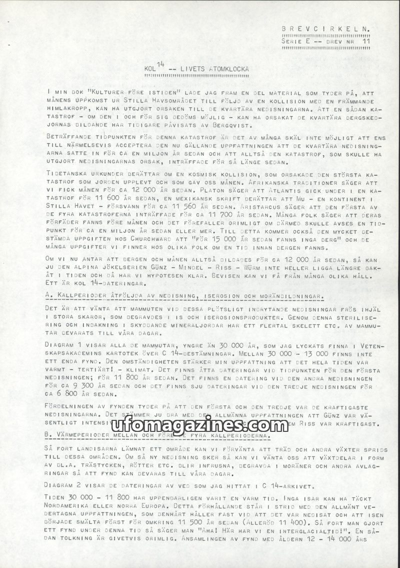 This issue of Brevcirkeln, dated April 1965, challenges conventional timelines for Quaternary glaciations and geological events. The author, Ivan Troeng, proposes that the Moon's f