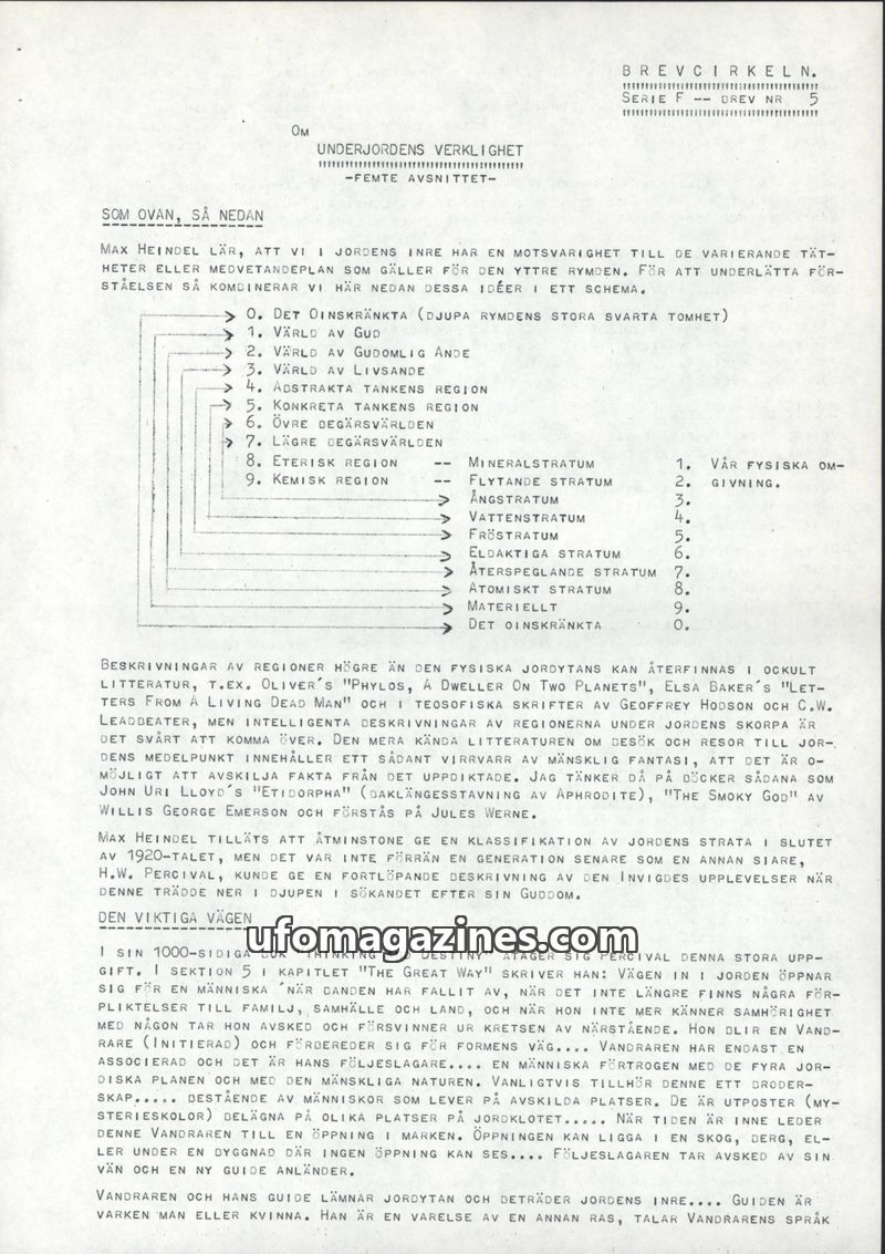 This issue of Brevcirkeln, 'Om Underjordens Verklighet' (On the Reality of the Underworld), explores the concept of an inner Earth and its various levels of existence, drawing on t