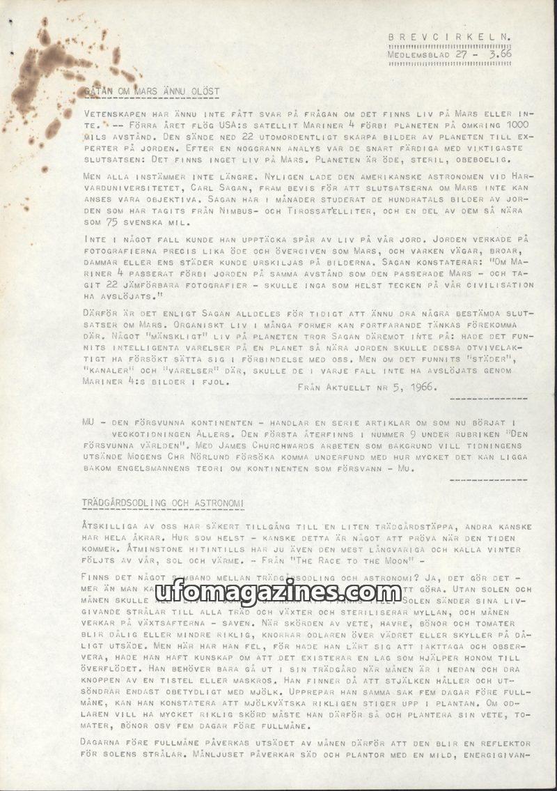 This issue of Brevcirkeln discusses the ongoing debate about life on Mars, challenging the initial conclusions drawn from Mariner 4's images. It also delves into the connection bet