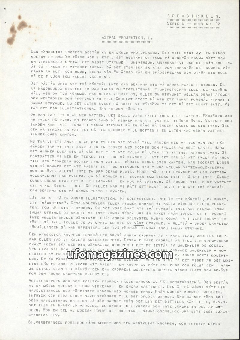 This issue of Brevcirkeln delves into Astral Projection, explaining the human body's composition of protoplasm and molecules. It posits that different vibrational frequencies allow