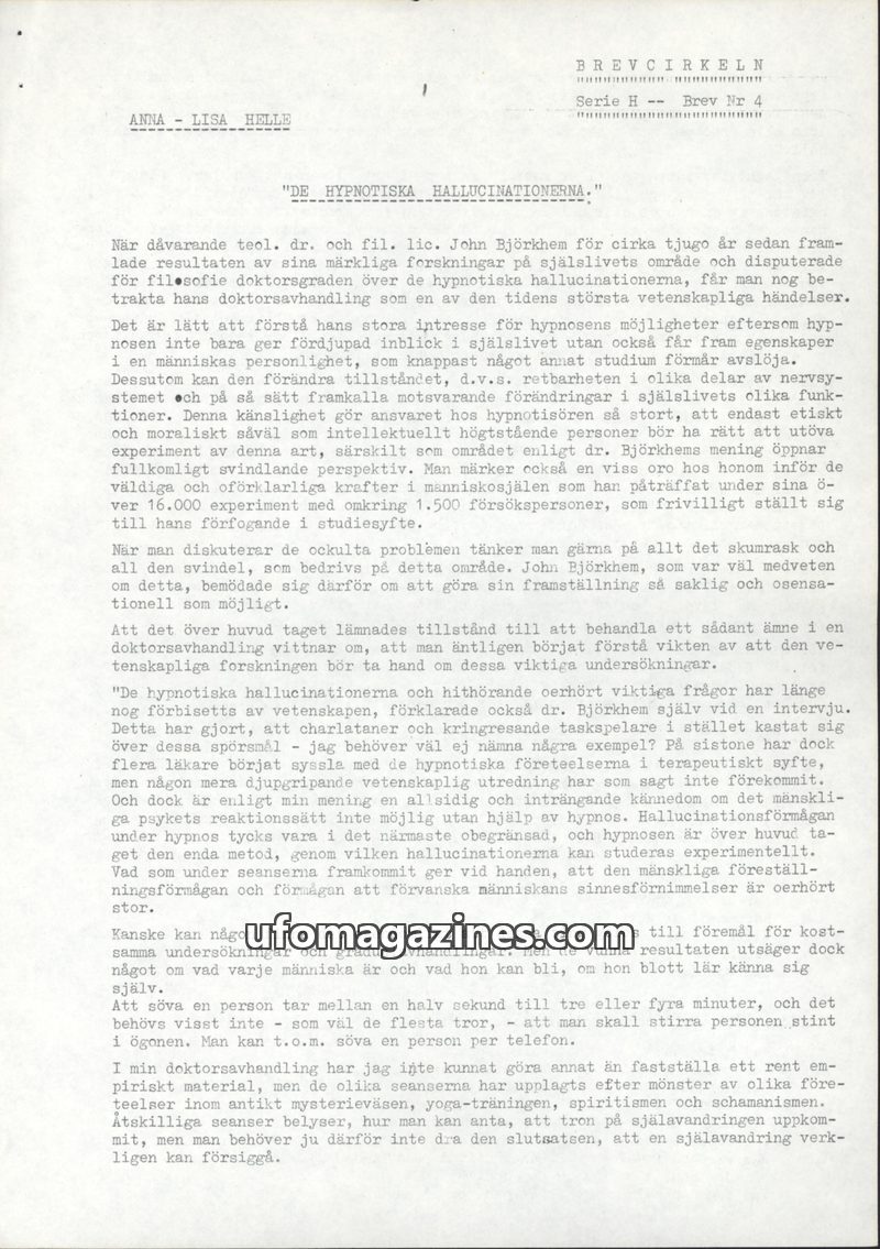 This issue of Brevcirkeln delves into the phenomenon of hypnotic hallucinations, primarily through the research of Dr. John Björkhem. It details experiments involving past-life reg