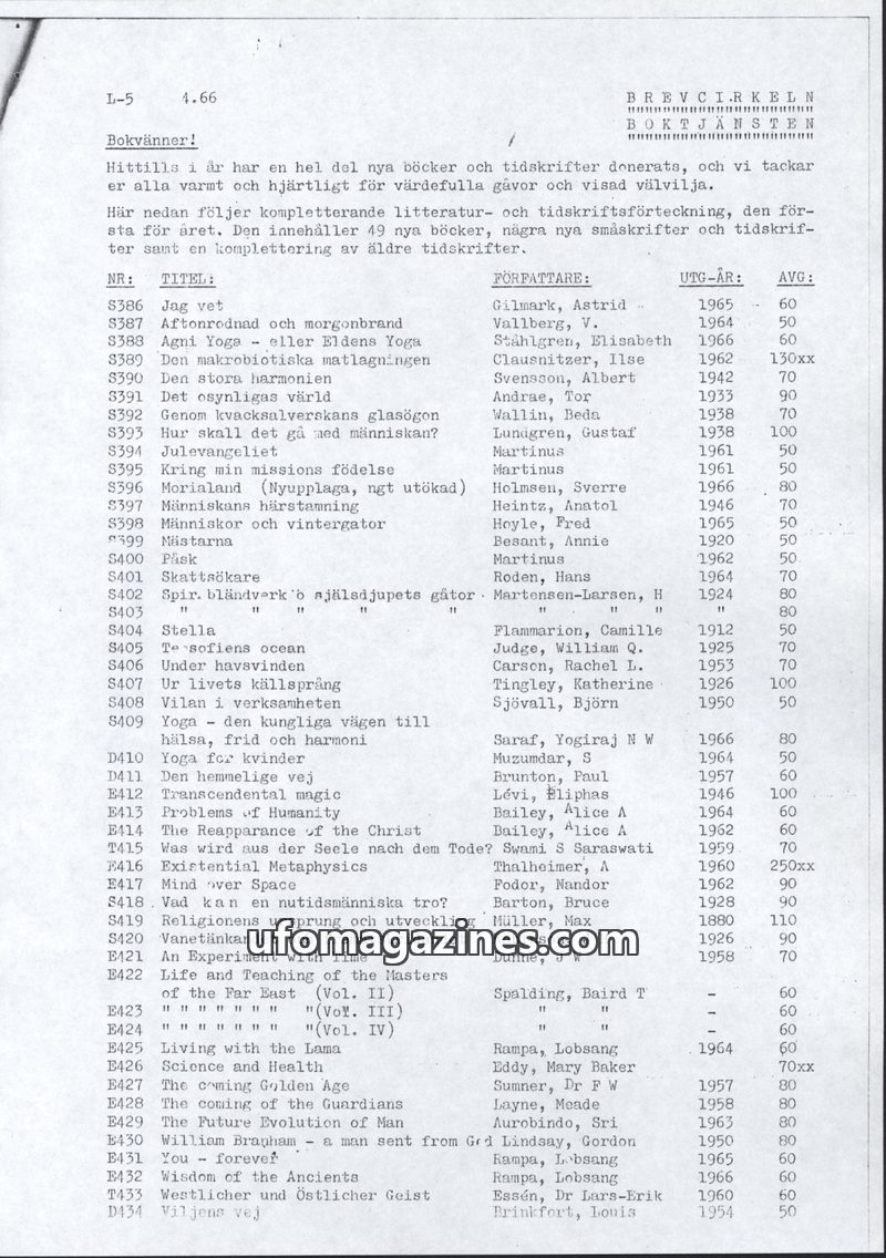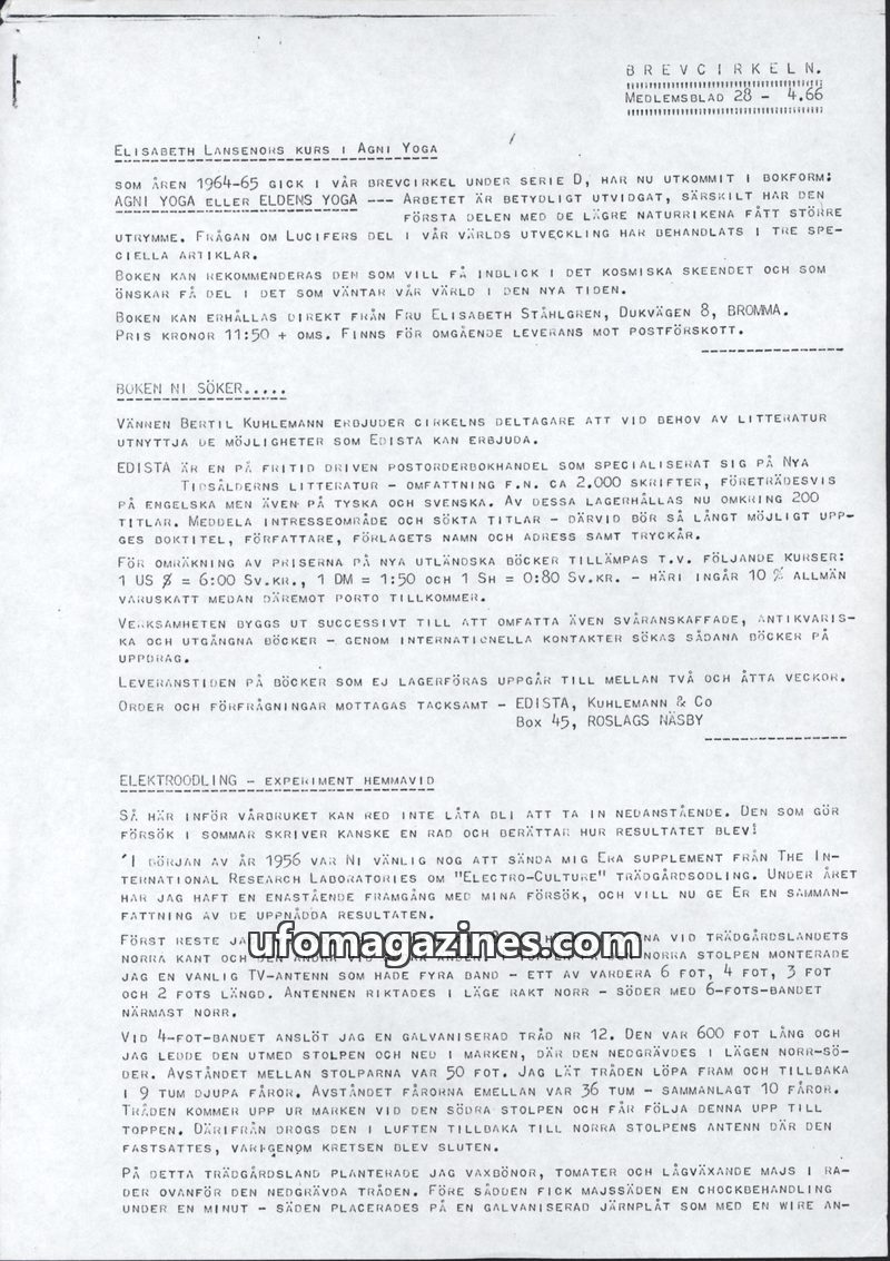 This issue of Brevcirkeln features a course on Agni Yoga, a book recommendation for 'Agni Yoga eller Eldens Yoga' by Elisabeth Lansenor, and an extensive report on electroculture g