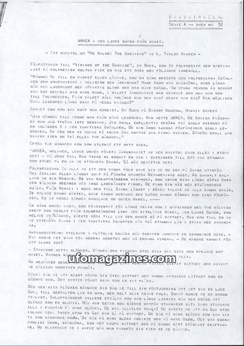 This issue of BREVCIRKELN discusses the legend of WAKEA, a figure from Polynesian mythology described as a light god from the sea. He is said to have arrived in the first century C