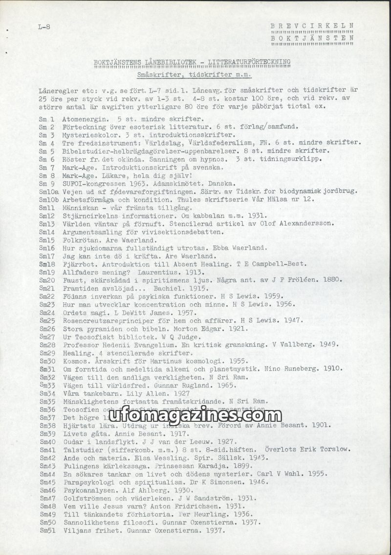 This document is a catalog from Boktjänsten's lending library, listing available small writings and periodicals. The collection spans a wide range of topics including esotericism,