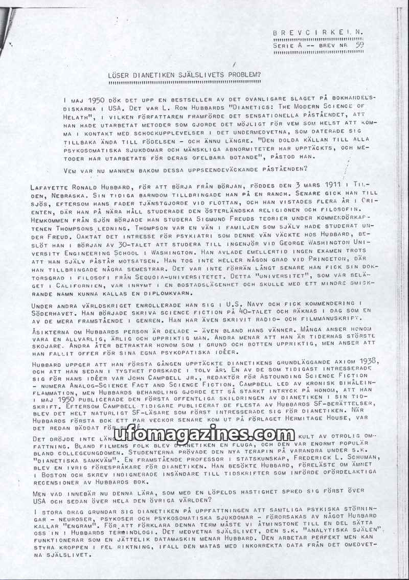 This issue of Brevcirkel Nr. 59 delves into L. Ron Hubbard's Dianetics, a bestseller in 1950s USA, which claimed to offer methods for accessing and healing subconscious shock exper