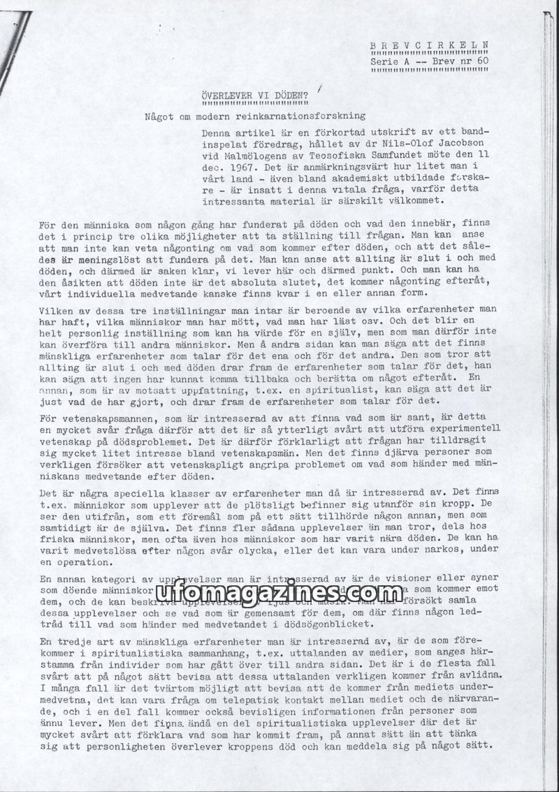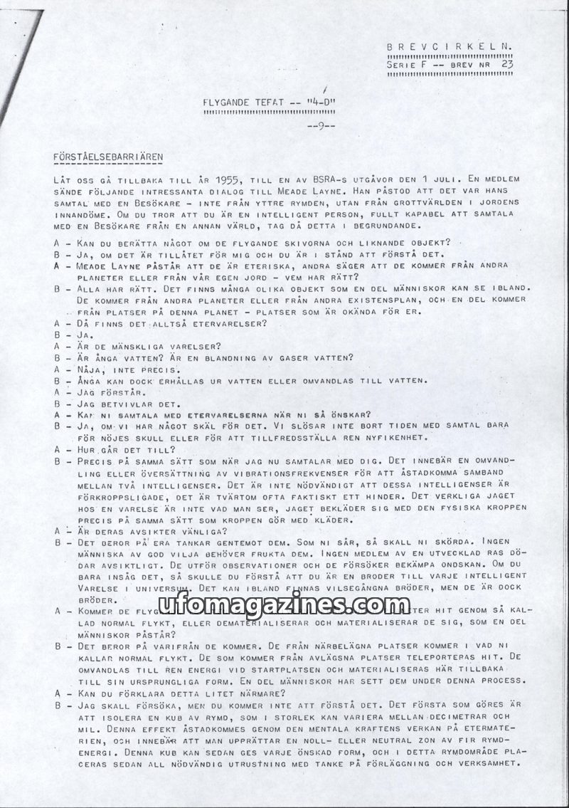 This issue of Brevcirkeln. features a dialogue with Meade Layne about flying saucers, which are described as eterial and originating from various planes of existence, not just othe