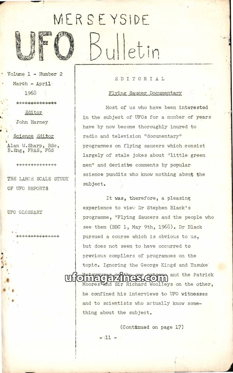 This issue of the Merseyside UFO Bulletin from March-April 1968 features an editorial praising Dr. Stephen Black's 'Flying Saucers and the people who see them' documentary for its