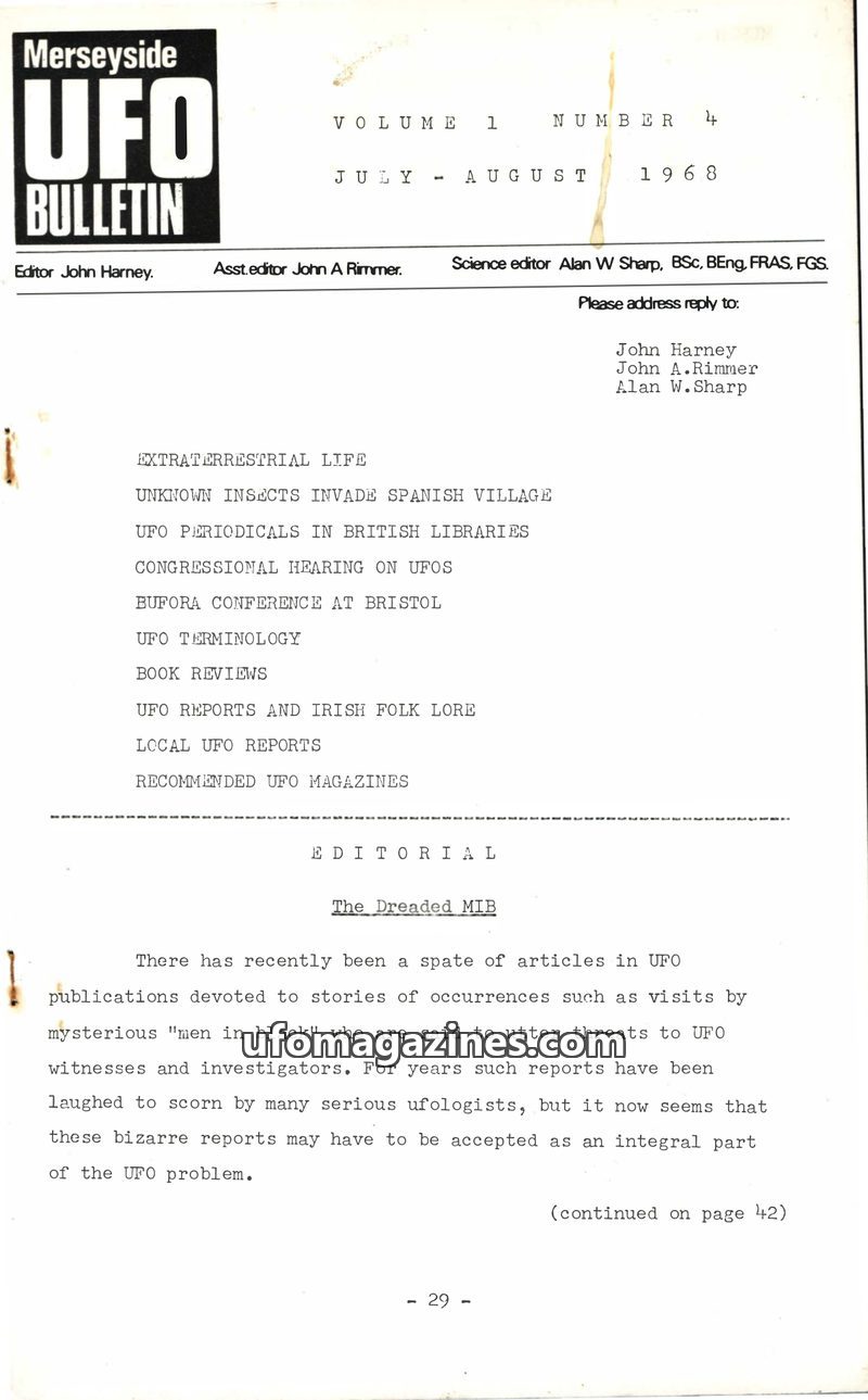 This issue of the Merseyside UFO Bulletin focuses on the 'Men in Black' (MIB) phenomenon, questioning whether these reports should be taken seriously. It details historical cases l