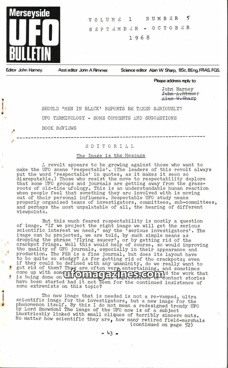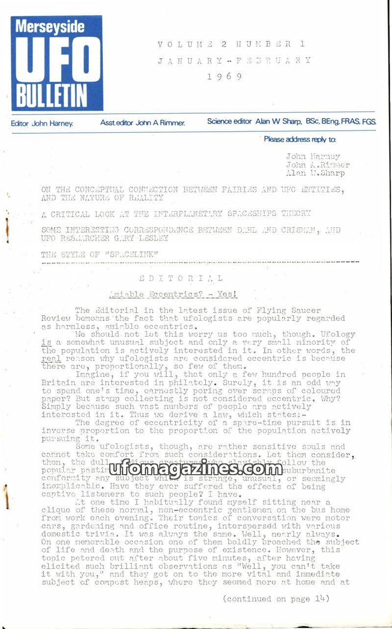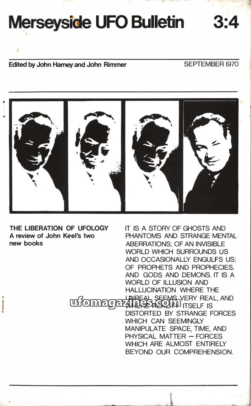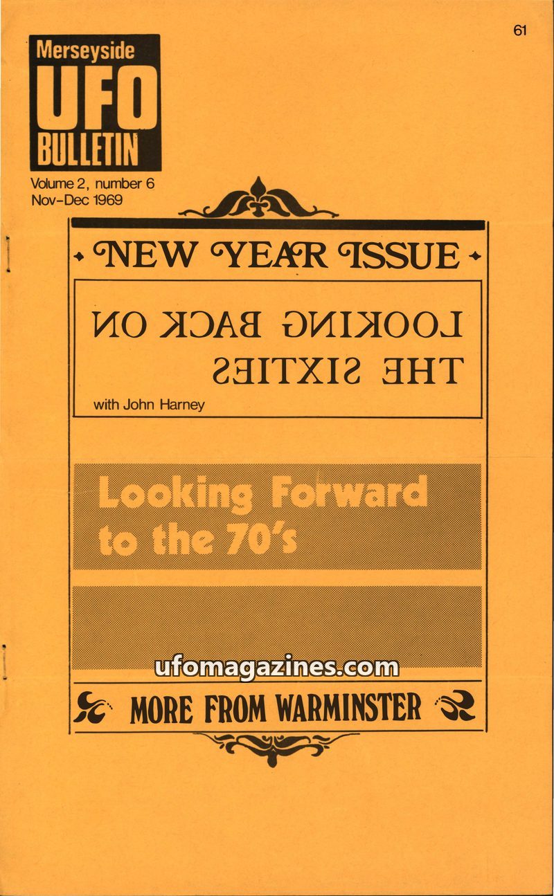 This issue of the Merseyside UFO Bulletin reflects on the past decade of UFO investigation and looks ahead to the 1970s. Editor John Harney discusses the role of small UFO journals